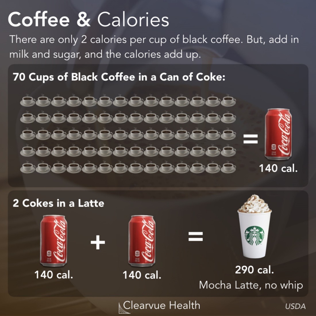 Debes tener en cuenta, sin embargo, que estamos hablando de café negro simple aquí. Una vez que agregas azúcar, leche y crema a tu bebida, es cuando se vuelve poco saludable. Según research by HarvardLa adición de las sustancias mencionadas anteriormente aumenta las calorías a aproximadamente 100.