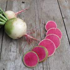 Rábano Sandía are native to China, where it is commonly recognized at Shinrimei Radish. This smooth, round, white in color fruit is made up of edible roots. Internally it has the most beautiful magenta-colored flesh, which is a little bit savory and crispy in taste. The size of it depends on when the fruit is harvested, whether in late autumn or spring. The whole fruit is rich in Vitamin C when consumed in raw form. It is composed of a chemical compound known as Isothiocyanate, which makes it organic. This watermelon can be served in a cooked form as well. Chinese people cook it with their seafood to add sweetness to it.